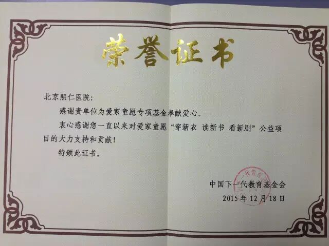 会企动态|北京熙仁医院荣获妇基会“2015年爱家·童愿”爱心证书