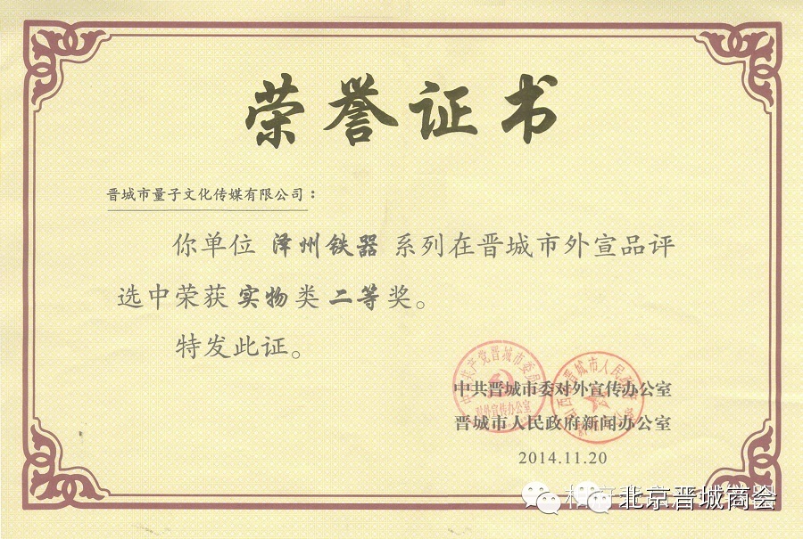日前,“相府壹品·泽州铁器”,在山西省委外宣办组织开展的全省外宣品评比活动中,入选全省优秀外宣品资料库名录;同时,“泽州铁器”系列荣获晋城市外宣品评选实物类二等奖。