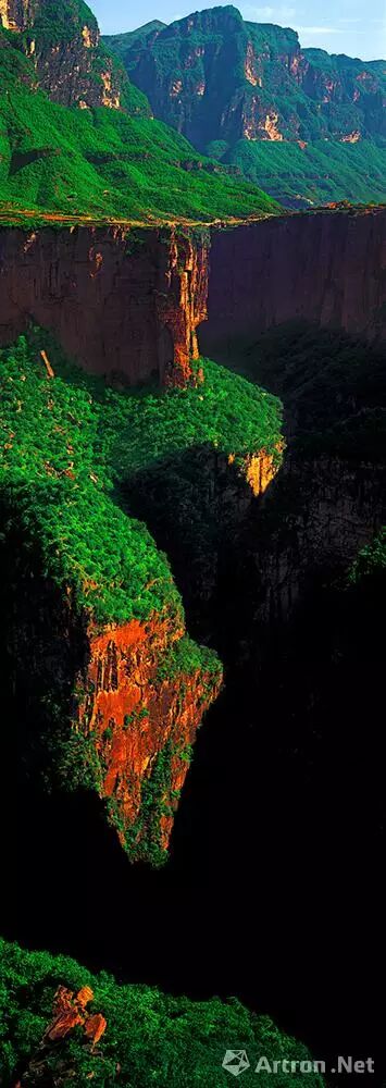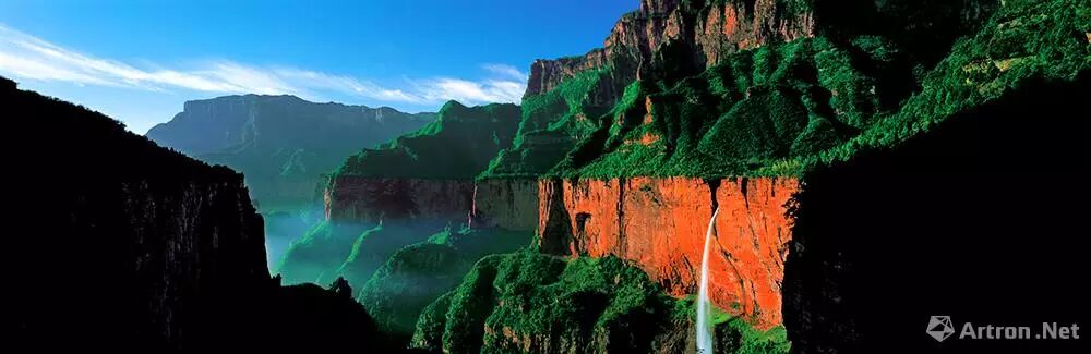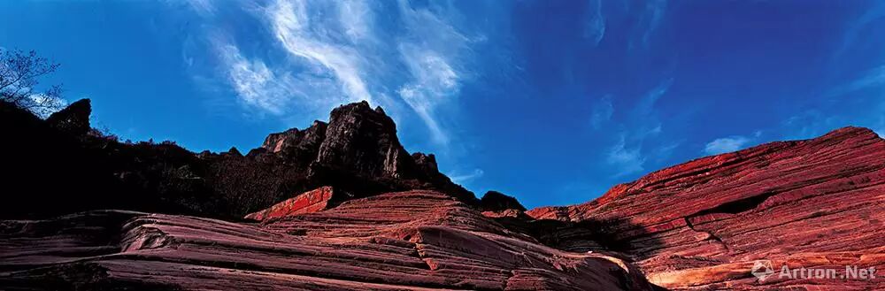 太行山是横向的美,最奇特景观是绝壁长崖,这种雄壮之美,大气之美,非使用长画幅和大画幅的相机不可。秦红宇特别喜欢617宽画幅相机,那种独特的视角非常适合表现太行山,横竖画面表现力都极强,横画幅气势宏大,壮观雄伟;竖幅最能展现绝壁深谷的全景,如同中国画竖条幅一样,上下全有。这种3:1的画幅,最符合中国画的方矩之美。这样的视角,可以淋漓尽致地展现出太行的伟岸、风骨的细节,突出太行山独有的精神与气节。