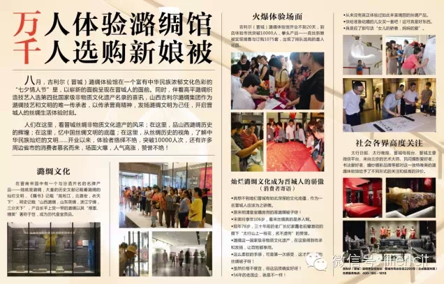 (晋城)潞绸体验馆盛大开业。人们在这里,看晋城丝绸非物质文化遗产的风采;在这里,品山西潞绸历史的辉煌;在这里,忆中国丝绸文明的底蕴;在这里,从丝绸历史的视角,了解中华民族灿烂的文明……