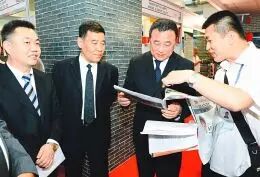 山西晚报记者郑书成(右一)向商务部贸发局局长孙成海(右二)等嘉宾介绍本报中英文特刊《晋行曲》